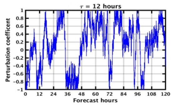 If ct < −1, then ct = −2 − ct, if ct ≥ 1, then ct = 2 − ct. χ is a random number that ranges from −1 to 1, t is the time step, dt is the model time step and τ is a constant in units of time. The choice of τ is arbitrary but nevertheless it is crucial for the frequency of changes of the perturbation coefficient. As an example, Figure 2 shows examples of the time evolution of the perturbation coefficient ct at every model time step for τ = 12 h.