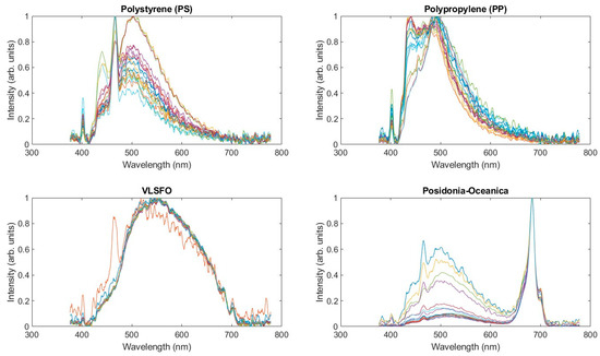 Some representative LIF spectra are shown in Figure 2. Background emission with the laser deactivated was always subtracted from the fluorescence signal. The spectra were smoothed with a Savitzky–Golay filter function of order 2 using a frame length of 27, due to relatively high noise. Spectra with a signal-to-noise ratio less than 10 were excluded from the study. The recorded spectra were normalized, since the measured intensity was highly variable between measurements for the same material, a fact that is also expected in a realistic scenario where material density, laser intensity and focal spot at different depths are highly fluctuating parameters. In addition to a fluorescence peak that was observed for all plastic materials around 500 nm, Raman emissions were also observed at 427 nm and 462 nm, similar to the spectra recorded in [8], although Raman or other peaks’ intensities varied due to different experimental conditions (i.e., spot size) that may have enhanced or suppressed different emission mechanisms in our study. Posidonia Oceanica and olive oil showed another intense peak close to 680 nm, which was not present in the spectra of other materials studied.