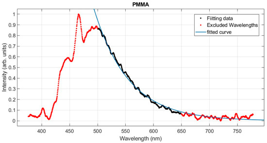 and exponential fitting was applied to estimate the exponential fitting coefficient , as is shown in Figure 3 in the case of a measurement for PMMA. The exponential fitting process was applied to each one of the 20 spectra measured for every sample and the average coefficient was derived, as well as the average R2, in order to evaluate to what degree the data fit the exponential nonlinear regression model.