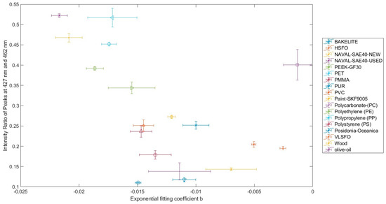 In Figure 5, the ratio P1/P2 of the proposed indicators in [8] is plotted versus the average calculated exponential fitting coefficient, as it is estimated by the 20 spectra for each sample. It is clear that the identification of different plastic materials is possible, as well as that of oil pollutants and natural substances.
