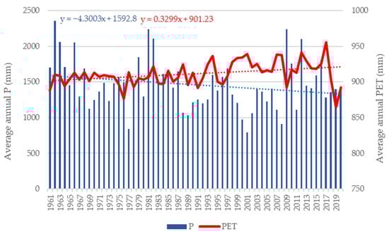 Figure 2 graphically depicts the temporal variability in P and PET parameters over the examined period (1961–2020). Our analysis reveals a decreasing trend of 4.3 mm per year in the annual precipitation rate, along with a slight increase of 0.3 mm per year in the annual PET. During the two climatic periods examined (1961–1990 and 1991–2020), an average annual precipitation decrease from 1536.5 mm to 1386.7 mm was observed, while the average annual PET remained relatively stable with estimated values of 904.8 mm and 917.7 mm, respectively. Similar findings have been obtained through studies in Greece’s mountainous regions regarding long-term climatic variables [,].