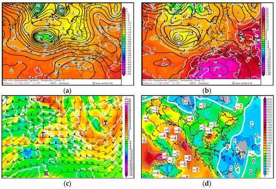 Analysis charts on 11 August 2021 at 12:00 UTC: (a) 500 hPa—geopotential height (gpdam) and temperature (color shading °C); (b) 850 hPa—geopotential height (gpdam) and temperature (color shading °C); (c) 300 hPa—wind speed (knots) and relative vorticity (10−5s−1); (d) Lifted Index (°K) and mixed-layer convective available potential energy (Jkg−1). www.wetter3.de (accessed on 28 August 2023).