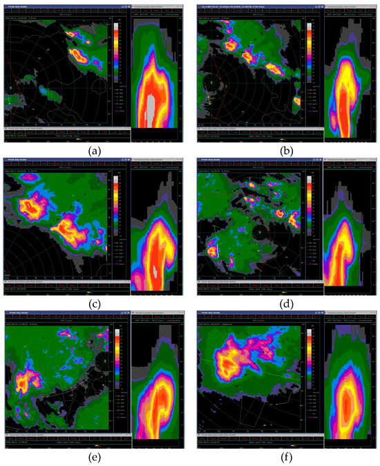 Radar reflectivity images and vertical cross-sections at different times and levels on August 11, 2021: (a) 14:02 UTC (5.5 km)—SC1; (b) 16:12 UTC (5.5 km)—SC2; (c) 16:15 UTC (4.75 km)—SC5; (d) 16:33 UTC (5.5 km)—SC4; (e) 17:35 UTC (5.5 km)—SC6; and (f) 18:22 UTC (composite)—SC6.