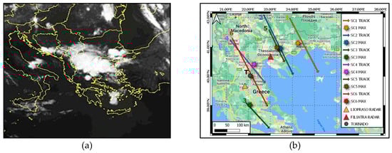 (a) Infrared satellite imagery of MSG on 11 August 2021 at 18:00 UTC. (b) Tracks of the six SCs. Each number indicates the SC identity. Positions of the maximum characteristics indicated by a star, and radar locations by a triangle.