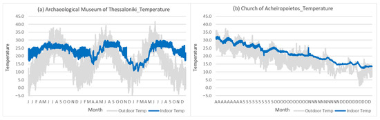 Hourly fluctuations (a) for the indoor and outdoor temperatures for the Archaeological Museum of Thessaloniki (for the period 1 January 2019 till 31 January 2021) and (b) for the Church of Acheiropoietos (for the period 1 August 2022 till 31 December 2022.).