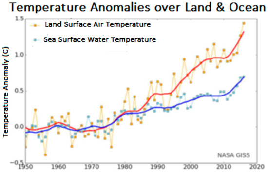 Temperature change from 1950 to 2020 according to NASA estimates (2017).
