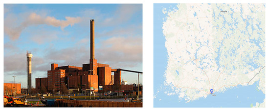 The Hanasaari A power plant was built in 1960–1967. Hanasaari B Power Station, built next to Hanasaari A, was commissioned in 1974. Hanasaari A was decommissioned in 2000 and decommissioned in 2008. Hanasaari B is a coal-fired cogeneration plant that produces electricity and heat. The power of the plant is 220 MW of electricity and it is equipped with two furnaces. The exact location of the unit is in Hanasaari, Sornaniner district in Helsinki and has the following map coordinates: 60°10.9′ N 24°58.0′ E, and the installation location is shown in Figure 2. Below (Figure 3 and Figure 4) are the average annual temperatures, highest annual temperatures and precipitation found from analyses carried out by the world bank “https://climateknowledgeportal.worldbank.org/country/finland (accessed on 24 March 2023)” on climate change for Finland for years 1901–2021. Finland experiences higher average temperatures due to warm air movements from the Atlantic Ocean (Gulf Stream). The average yearly temperature in the southwestern region of Finland is 5.5 °C, with a gradual decrease towards the northeast. Finland experiences rapid weather changes and unpredictable precipitation patterns. The average yearly precipitation in southern and central Finland ranges from 600 to 750 mm, with the exception of coastal areas. Northern Finland’s annual precipitation ranges from 450 to 650 mm.