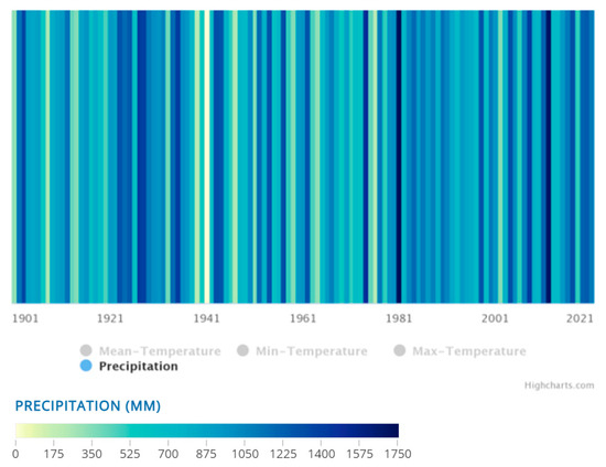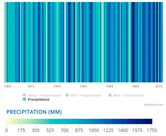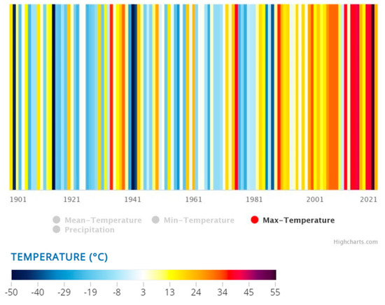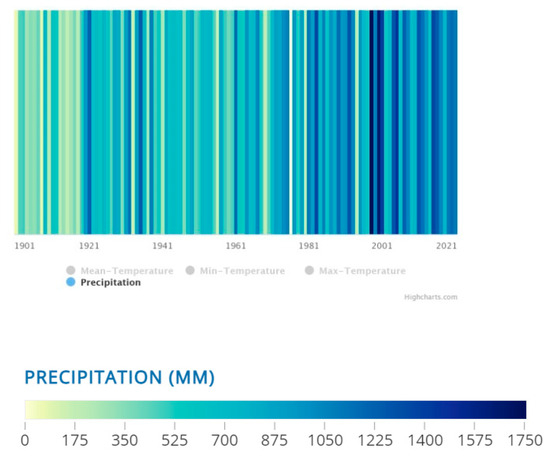 Figure 6 and Figure 7 present the average annual temperatures, highest annual temperatures and precipitation found from analyses carried out by the world bank “https://climateknowledgeportal.worldbank.org/country/sweden (accessed on 20 March 2023)” on climate change for Sweden for the years 1901–2021. These data refer to Norrbotten County, Sweden, where the above units are located. Generally, Sweden experiences moderate winters due to its proximity to the North Atlantic and prevailing south-westerly to westerly winds. However, the northernmost region of the country has a sub-Arctic climate characterized by long, cold and snowy winters. The mean daily temperature in July was highest in south-eastern Sweden at +17 °C, while it was slightly above 10 °C in the northern region. Low-pressure systems produce precipitation throughout the year, with the highest amount occurring during the summer and autumn seasons. Western Sweden receives the highest amount of precipitation due to the prevalence of low-pressure systems originating from the west or southwest.