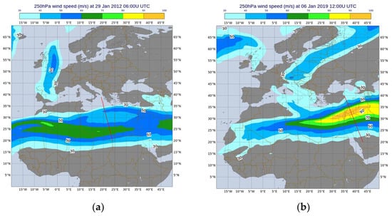 Wind speed of 250 hPa at (a) 29-01-2012 06:00 UTC (b) at 06-01-2019 12:00 UTC.