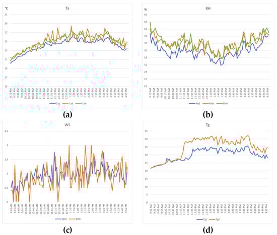 Air temperature values (a); relative humidity values (b); wind speed values (c); globe temperature values (d) as logged during the experiment.