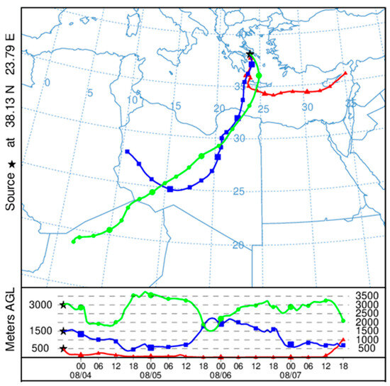 Applying the NOA HYSPLIT model, we found that after the Varymombi fire, the atmospheric circulation had a southerly direction. Smoke from the fires was carried a great distance from the source of the fire. Air masses at 1500 m and 3000 m reached Africa affecting countries such as Libya and Nigeria, while those at 500 m headed south towards Crete and then moved east towards Cyprus (Figure 1).