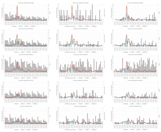 The effect of particulate pollution from the fires in Attica on the spread (Cases) (left panel), severity (Intensive Care Units) (middle panel), and mortality (Deaths) (right panel) of the pandemic, during the period 20 July–10 September 2021. First row: Southern Sector of Attica; second row: Northern Sector; third row: Central Sector; fourth row: Eastern Sector; fifth row: Western Sector.