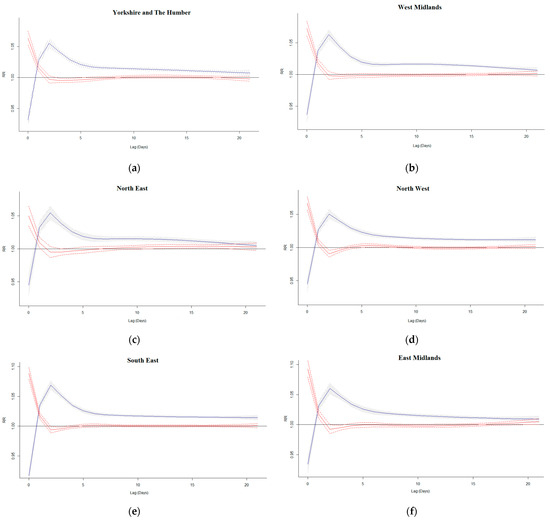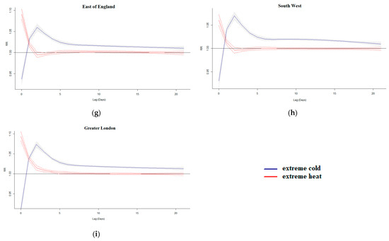Lag-response curves for exposure to extreme cold and heat in Yorkshire and The Humber (a), West Midlands (b), North East (c), North West (d), South East (e), East Midlands (f), East of England (g), South West (h), and Greater London (i).