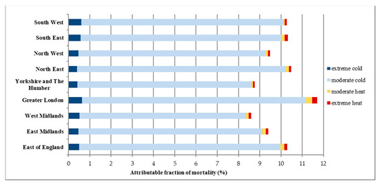 This work confirmed the increased vulnerability of the population in England to cold weather conditions and highlighted the impact of moderately low temperatures. On the whole, the South and the East were found to be more vulnerable to thermal stress, with the highest impact on mortality observed in Greater London. These findings could be used by local authorities to improve alerting and prevention strategies against both cold- and heat-related health effects. Further research should consider different age groups and confounding factors such as air pollution.