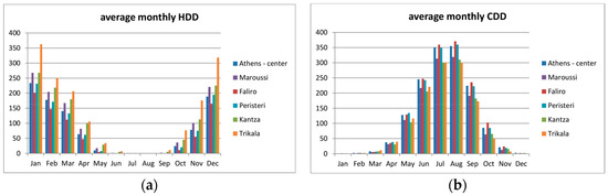 The average monthly HDD and CDD that are computed for each of the weather stations are illustrated in Figure 2. Their number is zero or close to zero for the three summer months (June–August) and September, so no heating is required, while in May and October it is particularly low. The heating needs are maximized from December to March when colder conditions prevail, while the months of April and November can be characterized as transitional since the heating needs are relatively limited. The highest average monthly number of heating degree days is found in Trikala for January and is equal to 362.6, while for the Athens area, the higher average monthly number of heating degree days is found in Kantza for January and it is equal to 268.0.
