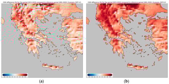 Average annual CDD difference for the period 2023–2030 compared to the reference period 1991–2020 for (a) RCP4.5 and (b) RCP8.5.