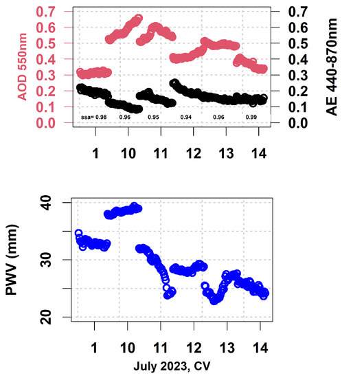 AERONET measurements of AOD at 550 nm, AE 440–870 nm, and PWV (in mm) from CV station, July 2022.