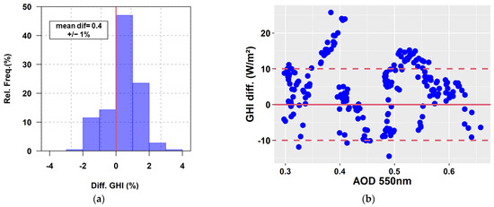 (a) Relative frequency of the GHI relative differences (%); (b) GHI differences versus AOD 550 nm.
