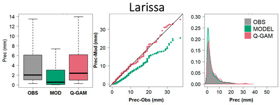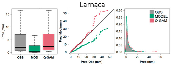 To evaluate the efficacy of the Q-GAM method in improving the distribution of the simulated rainfall values, we present a comparison of three data sets for the evaluation period (2000–2005). In particular, a statistical analysis compares the initial simulated daily rainfall amounts with the bias-corrected ones with the Q-GAM method and the observed values. The analysis is presented for the two studied stations (Larissa and Larnaca).