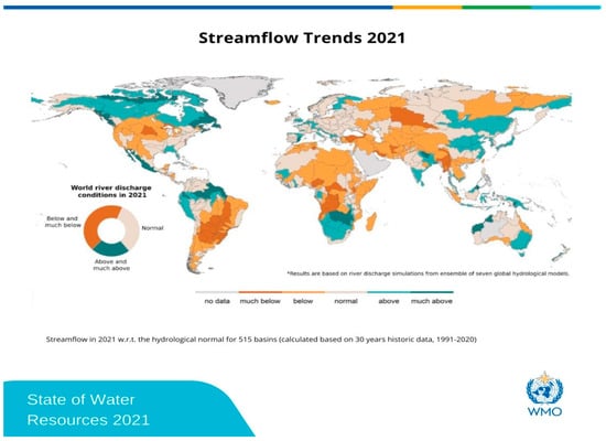 - World Meteorological Organization. State of Global Water Resources Report Informs on Rivers, Land Water Storage and Glaciers. Available online: https://public.wmo.int/en/media/press-release/state-of-global-water-resources-report-informs-rivers-land-water-storage-and (accessed on 11 April 2023).