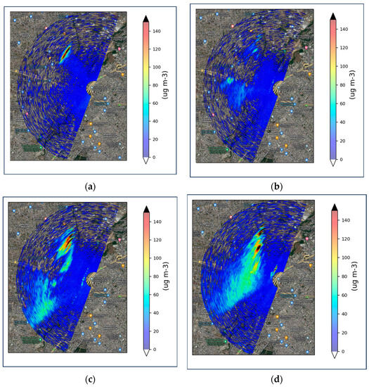 An urban fire’s suspected uncontrolled tire burning, emissions and plume dispersion are presented in Figure 5, in a sequence of six (6), 17 min horizontal scans. The presented radius of PM concentration levels is 2 km, and results have been filtered for values below 10 μgr/m3. The first PM emissions captured in Figure 5a correspond to maximum concentration levels near the source up to 341 μgr/m3. In Figure 5b, the PM concentration is significantly reduced over the source, hence the gap in the dispersion downwind, possibly attributed to plume elevation due to buoyancy. Additional emitting sources are then monitored, with concentration levels reaching near their source at a maximum of 476 μgr/m3 in Figure 5c and 184 μgr/m3 in Figure 5d, where the dispersed plume shows values more than 100 μgr/m3 several hundred meters downwind. In Figure 5e, the emission sources are decreased in number, but concentrations were locally found to reach 461 μgr/m3. Figure 5f shows the gradual reduction of emissions and advected plumes before the termination of the incident. In both Figure 5c,d, the emissions of a less intense and localized point source, very close to the lidar, correspond to emissions from an industrial site that reaches concentrations of maximum 230 μgr/m3. This particular source is also present in Figure 6e, while another similar industrial point source is also evident in Figure 6b, north-west of the latter.