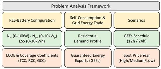 Acknowledging the above, the current study develops a computational framework for the evaluation of different prosumer schemes, capturing different RES–battery configurations (including both wind and solar power of residential scale) combined with practical market-integration strategies. For that purpose, we used a typical Greek household demand pattern and performed an extensive parametrical analysis concerning system size, spot price levels and degree of market integration. The schematic block of Figure 1 synopsizes the problem methodology, which, apart from the variation in system main variables (Nw: wind power; Npv: PV power; ESS: battery capacity), looks at the examination of different scenarios and the generation of energy and economic performance metrics, explained in Table 1 and Table 2, together with main parameters and assumptions.