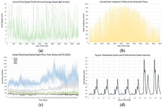 Meteorological time series were retrieved from the database of the Soft Energy Applications & Environmental Protection Lab, maintaining own experimental data records and data made available from the Greek Public Power Corporation (Public Power Corporation. “Wind Speed Measurements for Greece: 1980–1985”, in PPC Editions, Athens, 1986). Electricity price data were made available from ENTSO-E Transparency Platform—Available online: https://transparency.entsoe.eu/ (accessed on 20 May 2023).