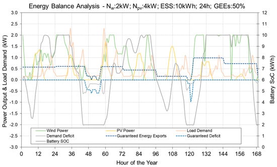 By applying the proposed methodology, we next proceed with the presentation of the results of the brute force approach currently adopted. Prior to that, in Figure 3, we provide an exemplary instance of energy balance analysis for a week-long period and for a representative RES–battery configuration, following a 24 h GEE trading schedule for the day-ahead. To that end, as one may note, the GEEs are re-estimated on a daily basis, depending on the anticipated RES production for the day-ahead, and is currently assumed to be covered in priority against self-consumption needs, first from the side of the RES component, and secondly from the battery component side. In the same context, the inability of the combined RES–battery system to serve the GEEs and self-consumption needs leads to the occurrence of deficits, which are on the one hand penalized (guaranteed energy) and on the other covered through grid electricity imports (self-consumption).
