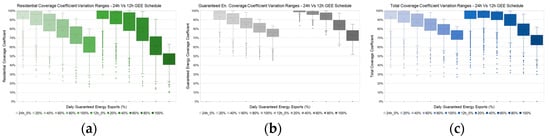 Accordingly, in the following set of figures (Figure 4, Figure 5, Figure 6 and Figure 7) we present the results of the brute force analysis for the entire range of configurations examined. In more detail, in Figure 4, the results of the RCC, GCC and TCC are provided, in relation to the variation in the GEE value (from 0% to 100%) and the two different selling schedules examined, i.e., the 24 h and the 12 h schedule. As one may see, an increase in GEEs leads, as expected, to a reduction in coverage coefficients, which is less intense in the case of the guaranteed energy coverage, since the latter is also served in priority. At the same time, 24 h schedules yield lower values for the majority of GEE values, for both GCC and RCC, with the overall values of the TCC found to range between ~65–100%.