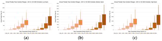 Variation ranges of penalty fees for low (a), medium (b) and high (c) market prices in relation to the variation in GEEs and examined GEE time schedules.