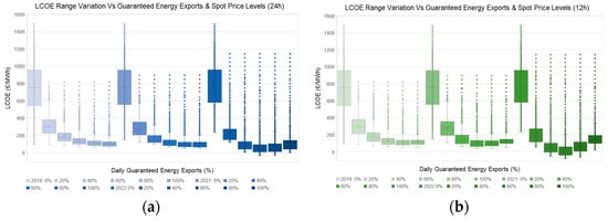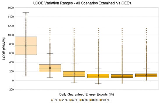 Finally, in the last figure, Figure 7, we grouped together the results of all scenarios examined in the given study and again related them to the variation in GEEs. The resulting variation ranges of LCOE incorporate all three years of market prices, the entire set of configurations and both the 24 h and 12 h schedules. In this context, the given ranges may be considered as representative for a broad pool of prosumers and market conditions for the case of Greece. With this in mind, optimum solutions were found in the area of 80% for GEEs, which represents a conclusive finding of our research, with the option of market integration generating a significant reduction in LCOE, even for GEEs in the range of 20%.