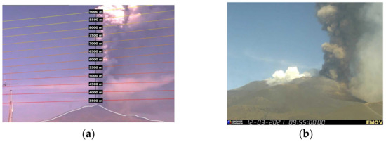 Etna activity on the 12 March 2021 as seen from INGV-OE video surveillance systems. (a) Explosive activity during the paroxysmal phase, ranging between 4 and 10 km a.s.l., as estimated by the visible camera of INGV-EO. (b) The EMOV camera shows the decrease in the explosive activity after about 10:00 UTC.