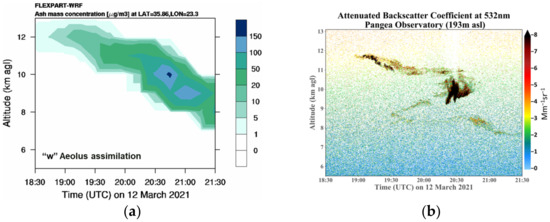 Aerosol profiles derived from the PollyXT lidar system [13,14], operating at the PANGEA observatory, were used to evaluate the different plume dispersion simulations. Figure 3b shows the time–height evolution of the PollyXT lidar observations in terms of the attenuated backscatter coefficient at 532 nm above the PANGEA station, depicting a dense aerosol layer in the altitudes between 7 and 12 km, from 18:30 to 21:30 UTC, on the 12 March 2021. Whereas the FLEXPART vertical cross-sections of volcanic ash concentrations (Figure 3a) show a similar pattern for the observed aerosol layer over the PANGEA station, only when Aeolus assimilated wind fields are used. Ash plume is modelled between a 7 and 11 km height. On the contrary, the simulations performed without Aeolus assimilation fail to depict the observed structures above PANGEA station for the same period (not shown in Figure 3a).