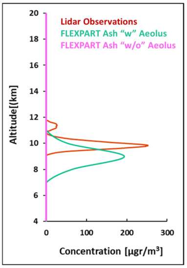 The lidar derived volcanic ash concentrations over PANGEA reached up to 250 μg/m3 at the plume’s center of mass (red line in Figure 4). The FLEXPART simulated ash mass concentration values are about 220 μg/m3 (green line in Figure 4) and are in good spatio–temporal agreement with the lidar-derived product, despite a slight vertical shift of 1 km observed between the modeled and observed profiles, which can be critical for aviation safety.