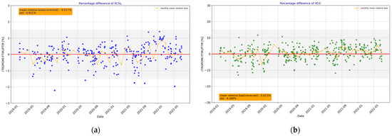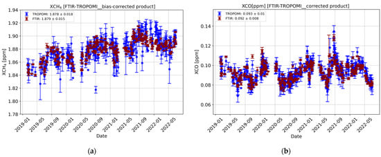 In the following section, the comparison between the methane and carbon monoxide total columns from EM27/SUN ground-based measurements and space-borne TROPOMI data is presented. Daily means of both FTIR and TROPOMI dry-air column mixing ratios are presented (Figure 1) for clear/partially clouded sky conditions for XCH4 (a) and XCO (b). Also, in Figure 2, the relative mean bias of XCH4 (a) and XCO (b) for the standard (green line) and corrected (orange line) products are compared. TROPOMI observations capture the time series of FTIR measurements for both products, and in the case of XCO, this peaks during summer 2021 as a consequence of fire episodes.