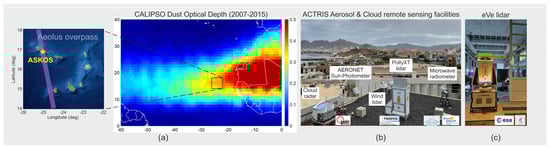 (a) ASKOS site in Cabo Verde, Aeolus Friday afternoon orbit, and dust optical depth (DOD) over Cabo Verde, based on CALIPSO 2007-2015 measurements, (b) ACTRIS aerosol and cloud remote sensing facilities employed, and (c) ESA’s reference lidar eVe during ASKOS.