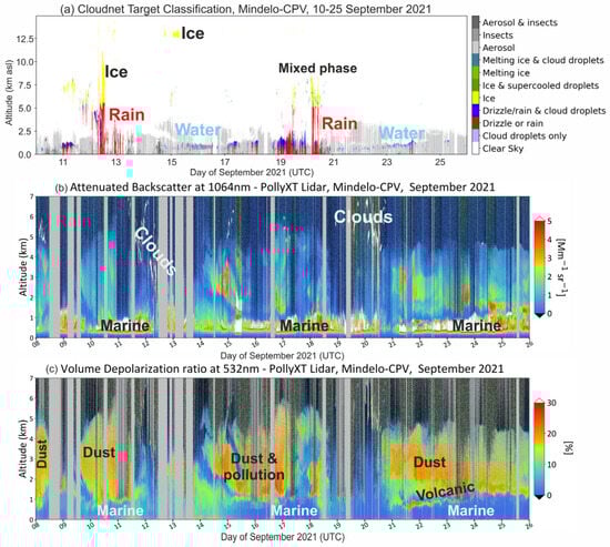 Overview of (a) the Cloudnet target classification, (b) the PollyXT lidar backscatter coefficient at 1064 nm, and (c) the PollyXT volume depolarization ratio at 532 nm, as measured at the ASKOS site during the September 2021 operations.