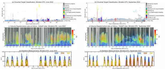 Cloudnet target classification (a,b), PollyXT volume depolarization ratio at 532 nm (c,d), and surface radiation measurements (global horizontal irradiance—blue, direct normal irradiance—red, and diffused irradiance—yellow) (e,f) as measured during ASKOS in June/September 2022.