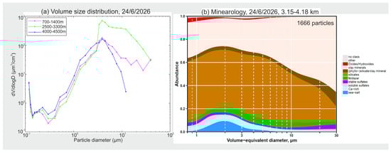 (a) High−altitude volume size distributions in three layers, obtained with the POPS and UCASS instruments flown on the CoBi UAV on 24 June 2022. The presence of large dust particles is highlighted. (b) Mineralogy of the observed particles from the layer 3.15–4.8 km on the same flight.