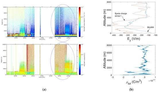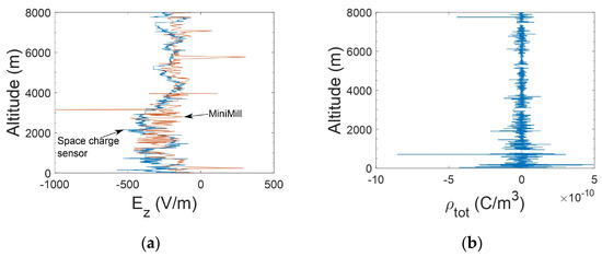 Vertical profiles of the electric field vertical component and the total charge density: (a) the corrected vertical profiles of the electric field vertical component measured by the MiniMill and the space charge sensor; (b) vertical profile of the total charge density measured by the space charge sensor.