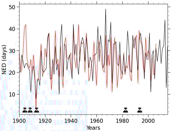 Time series of the July–August NED (days) over the 1900–2015 period in 20CR (black) and L days (red). Black volcano symbols indicate major volcanic eruptions.