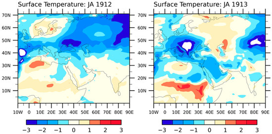 Surface temperature anomalies in the summers (July–August mean) of 1912 and 1913.