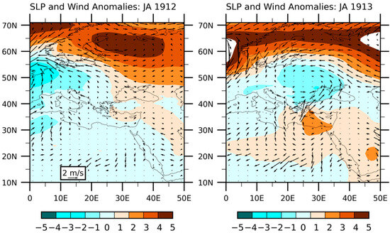 The surface cooling in the two summers after the eruption is associated with an increased SLP in the EMed and Anatolian low, particularly in the summer of 1913 (Figure 3) that exceeds 3 hPa. This SLP pattern suggests a reduced SLP gradient over the Aegean Sea, which should cause weaker wind speeds as evidenced by the southerly anomalies of about 2 ms−1 (arrows in Figure 3). Hence, as discussed in the previous section, fewer days with Etesians are expected. Similar patterns of a forced response to volcanic eruptions have also been simulated with climate models [4,10].