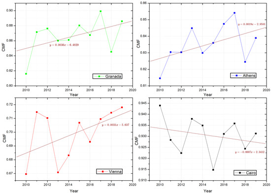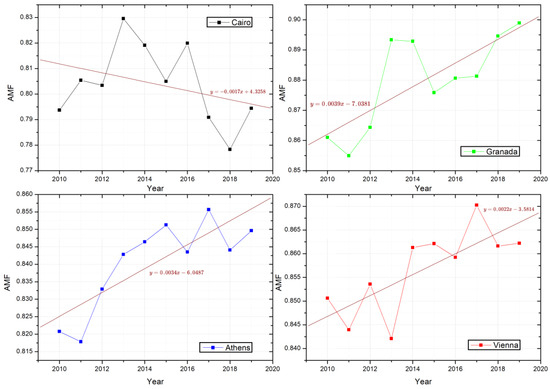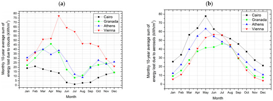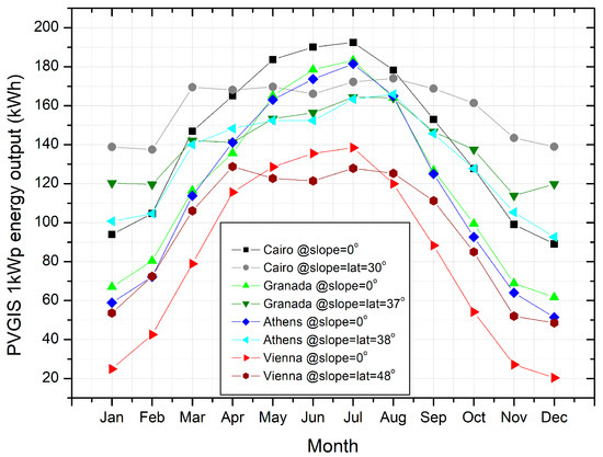 Solar Photovoltaic Energy Production Conditions in the Urban Environment of Athens, Cairo, Granada and Vienna †