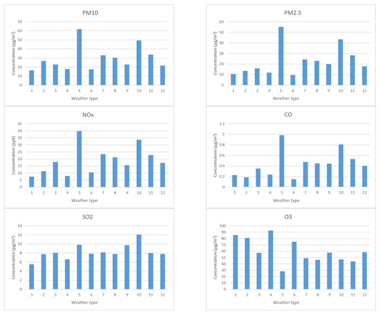 Mean concentrations of PM10, PM2.5, NOx, CO, SO2 and O3 for each of the defined WTs.