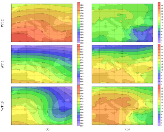 Mean 12UTC patterns of (a) 500 hPa and (b) 1000 hPa geopotential height (gpm) for WTs 2, 5 and 10.