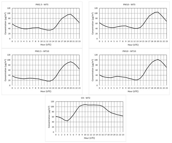 The mean diurnal variations of PM2.5 and PM10 concentrations for WTs 5 and 10 and O3 concentration for WT2 are presented in Figure 3. It is shown that, in terms of PM2.5 and PM10, the maximum concentration appeared in the evening and exceeded 90 and 100 mg/m3, respectively, for both WTs. This is connected to the increased biomass burning for house heating purposes in the evening. In terms of the diurnal variation in O3 concentration, the maximum was found during the day and specifically during periods of intense solar radiation, as expected for a photochemical pollutant like ozone.
