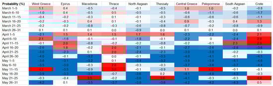 Plotting of deviation (5-day periods). Gradient color scale from −30 degrees Celsius (negative deviation: deep blue to light blue) to +30 degrees Celcius (positive deviation: light red to deep red) [10].