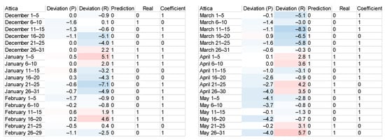 Predicted deviation vs. real deviation and coefficient values (per season). Gradient color scale from -30 degrees Celsius (negative deviation: deep blue to light blue) to +30 degrees Celcius (positive deviation: light red to deep red).