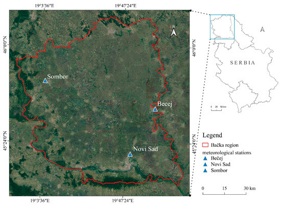 Geographical location of the Bačka region and meteorological stations used in this study.